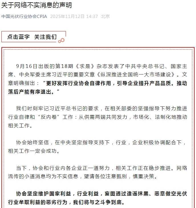 随后,赶在A股收盘之前,中国光伏行业协会也紧急回应此事。在午后14点37分,中国光伏行业官微发布《关于网络不实消息的声明》。声明指出,在相关部委的坚强指导下努力推进行业自律和“反内卷”工作:从供需两端共同发力,市场化、法制化地推动相关工作。协会始终坚信,在中央坚定指导支持下,行业,企业积极协调配合下,相关工作一定会成功。当下,协会和行业内各企业正一道努力,相关工作正在稳步推进。网络流传的小道消息均为不实信息,望请各位注意甄别,慎重决策。